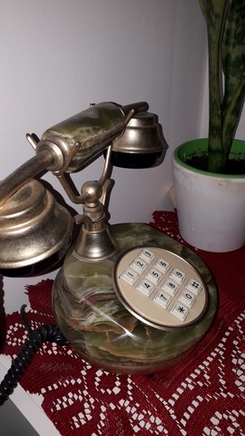 Questo bellissimo telefono vintage è realizzato in Italia. Le parti verdi del telefono sono realizzate in onice verde una forma di quarzo. Le parti dorate del telefono sono placcate oro 24k. si può immaginare che tipo di famiglia possedesse un telefono placcato in oro 24k. Il telefono è molto pesante. La presa telefonica è una presa tripolare telefonica, il primo tipo di presa telefonica utilizzata in Italia.